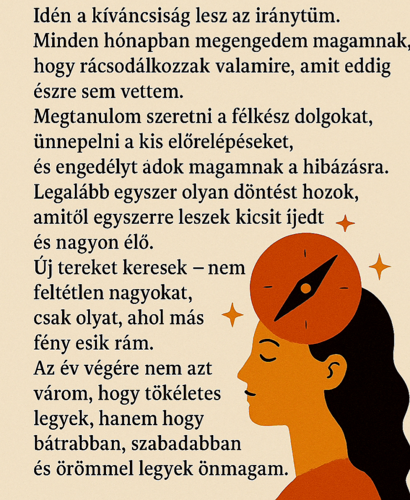 This year, curiosity will be my compass. Every month, I’ll allow myself to marvel at something that I hadn’t even noticed before. I’ll learn to love semi-finished things, to celebrate any small steps forward, and I’ll also give myself permission to make mistakes. I’ll make at least one decision that makes me feel a bit scared but very much alive. I’ll look for new spaces – not necessarily big ones, just some place where a different kind of light will shine on me. I don’t expect myself to become perfect by the end of the year but to be myself more bravely, freely and joyfully. This year, I’ll not only discover the world but my own boundaries, too. Every month, I’ll try something that will make me look at myself in a new light. If I get stuck, I’ll change directions – I won’t give up, just turn the compass. By the end of the year, I’ll have more curiosity than doubt. This year, I’ll be collecting days, not achievements. Moments that I can be proud of – no matter how small they are. If I see something beautiful, I’ll pause, recognize it, and take it with me. By the end of the year, I’ll have a hundred days I’d want to relive.